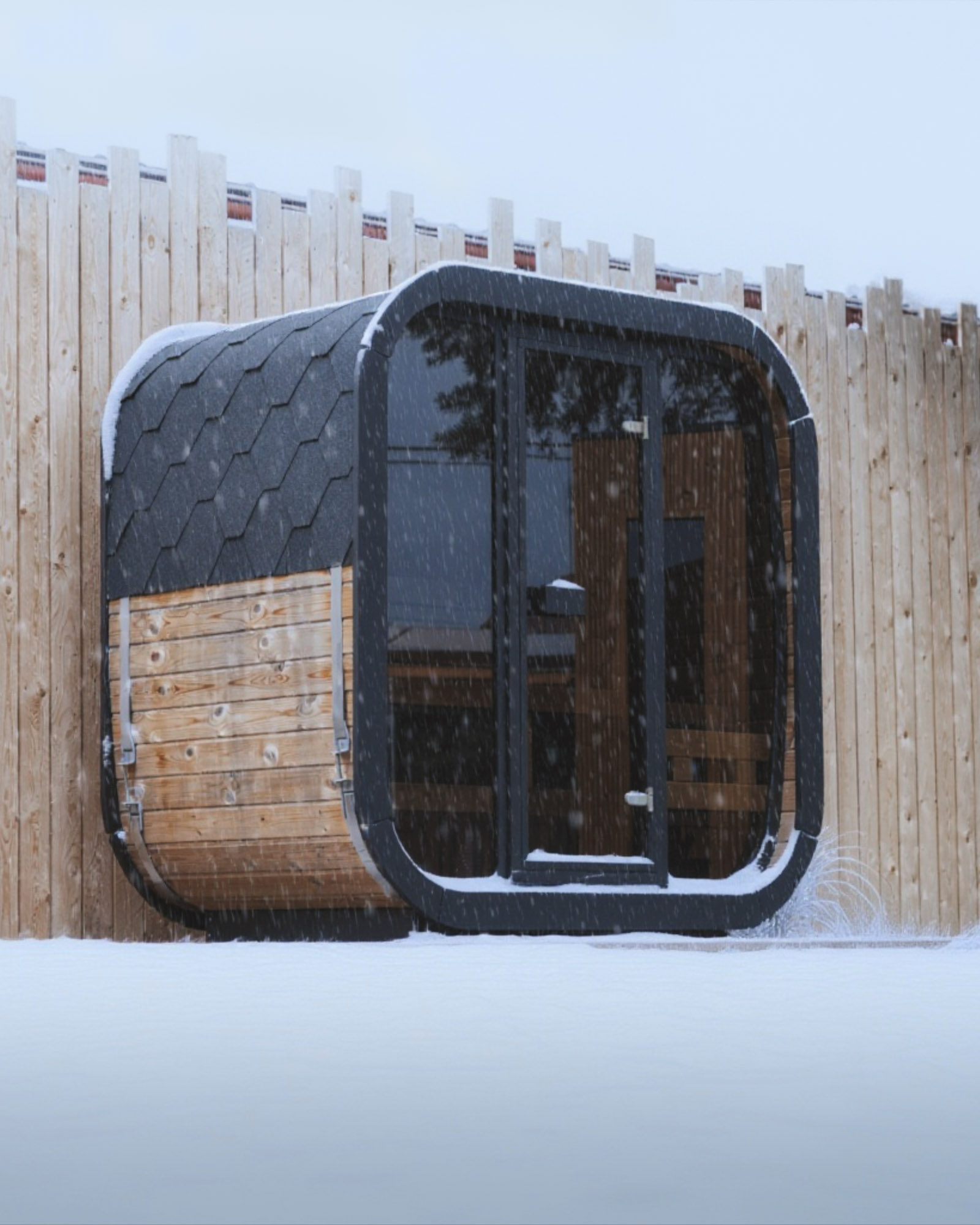Tato finská exteriérová sauna je vyrobená z masivu thermoborovice tloušťky 42 mm – boční stěny/ 28 mm zadní stěna, rám prosklené čelní stěny je vyroben z kvalitní překližky, dřevo je pohledově upraveno z obou stran.